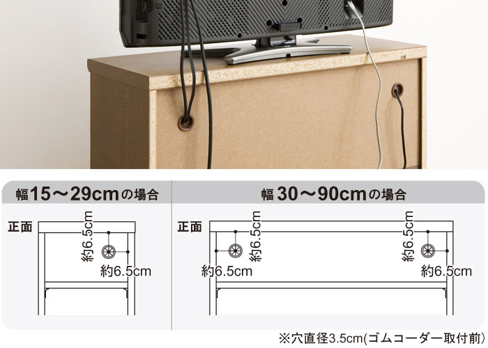 配線を裏側へ引き出すための加工穴をご用意しています。(ゴムコーダー付き) 穴の位置、サイズの詳細は上図を確認ください。