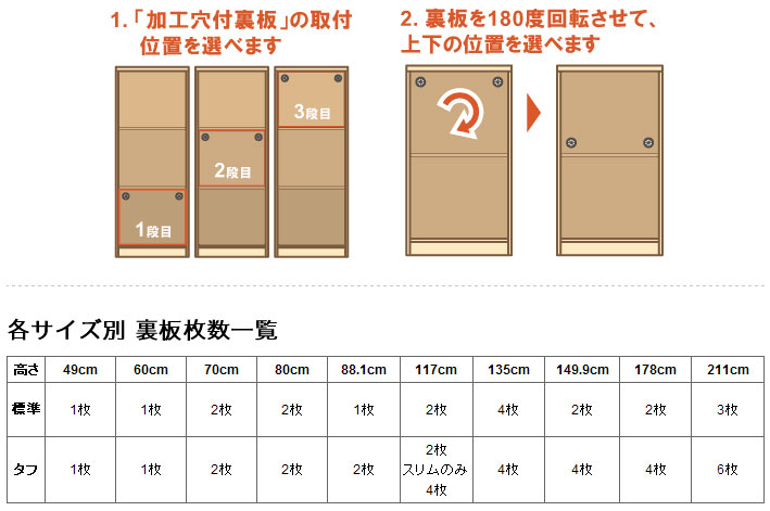 穴の位置は、下図のように取り付け位置や取り付け方法により柔軟に対応します。 複数枚の裏板に加工を施すことも可能です。「各サイズ別 裏板枚数一覧をご参照ください。